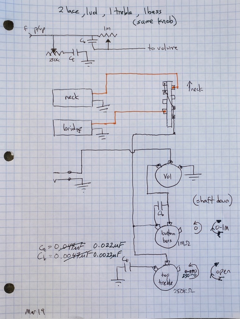 You will notice that the bass and treble capacitors have been crossed out and re-entered. After building the guitar and testing the sound, I was disappointed to find the effects very subtle and barely noticeable. At first I thought I had mis-wired the circuit but eventually I decided to try different capacitor values. Eventually I landed on a value I liked.