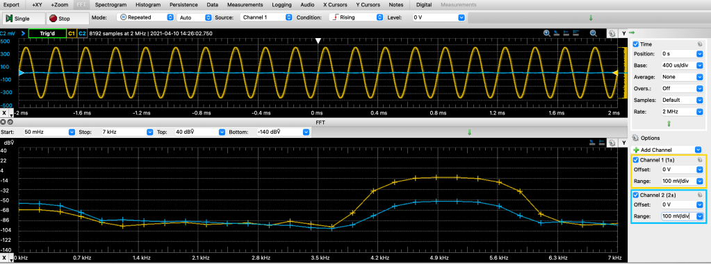 Now lets consider a high frequency input signal. Here is a graph of the response to a 5 KHz input signal. This input signal is very close to the resonant frequency of the pickup and we clearly see that in the output – channel 2 (blue) is showing approximately 900 mV peak to peak, far more output than when receiving a 400Hz signal. The FFT and input signal windows are included below.