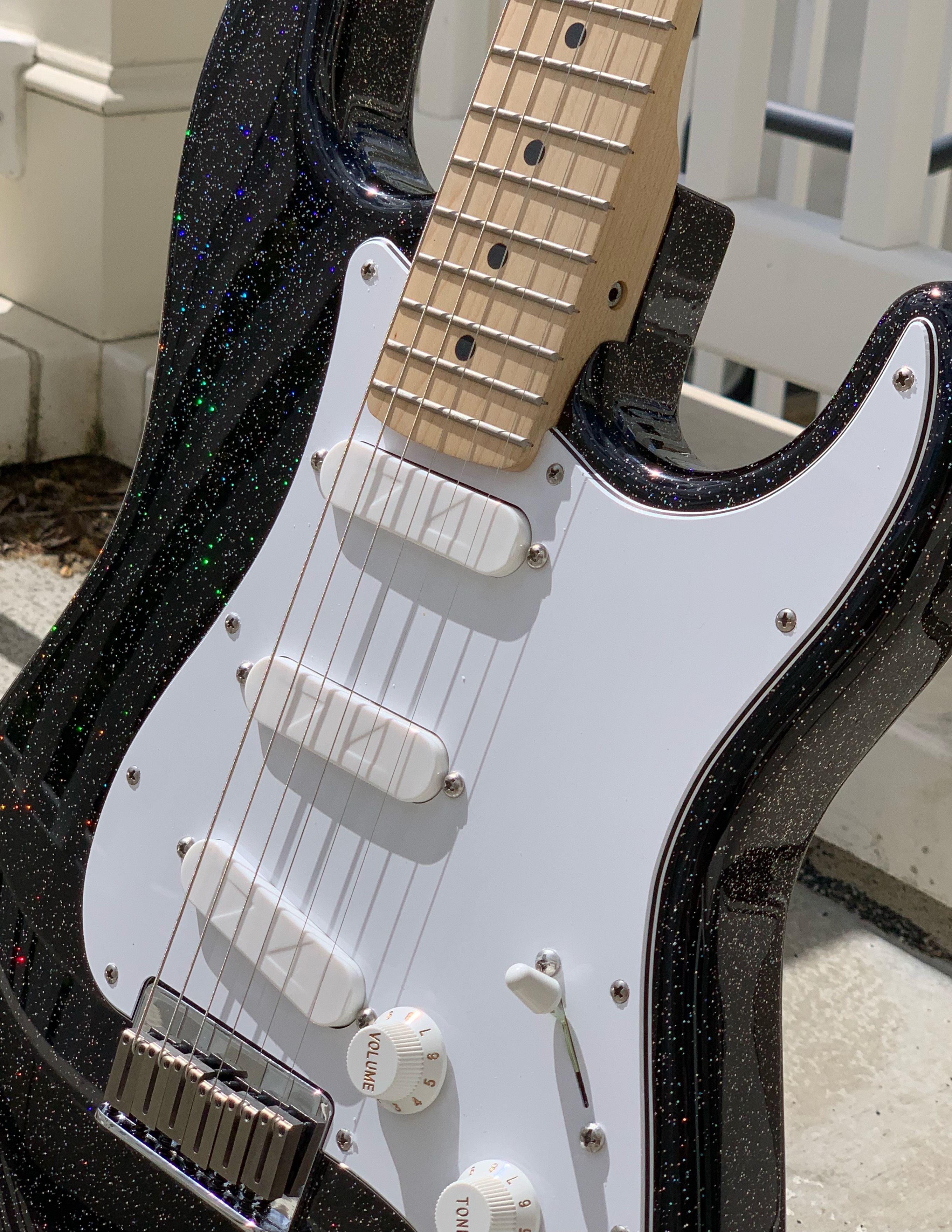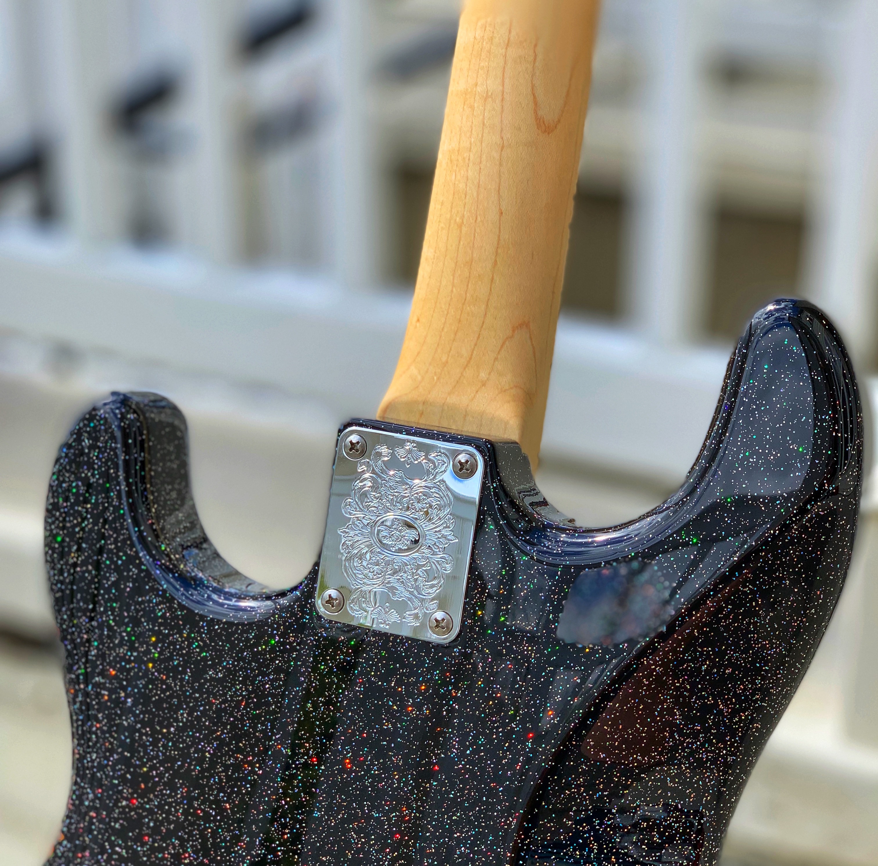 Chambered stratocaster shape, holoflake paint, gloss finish.