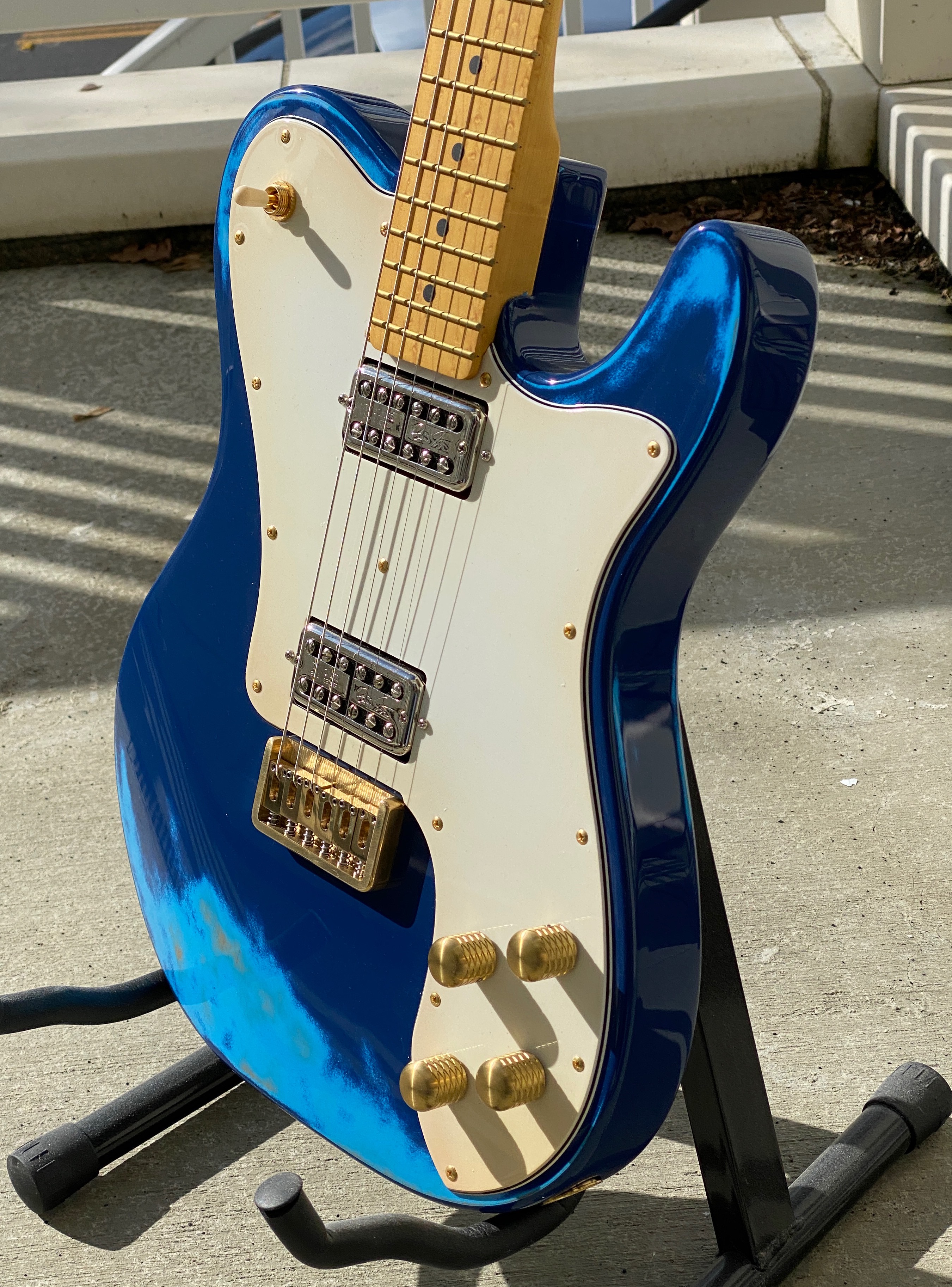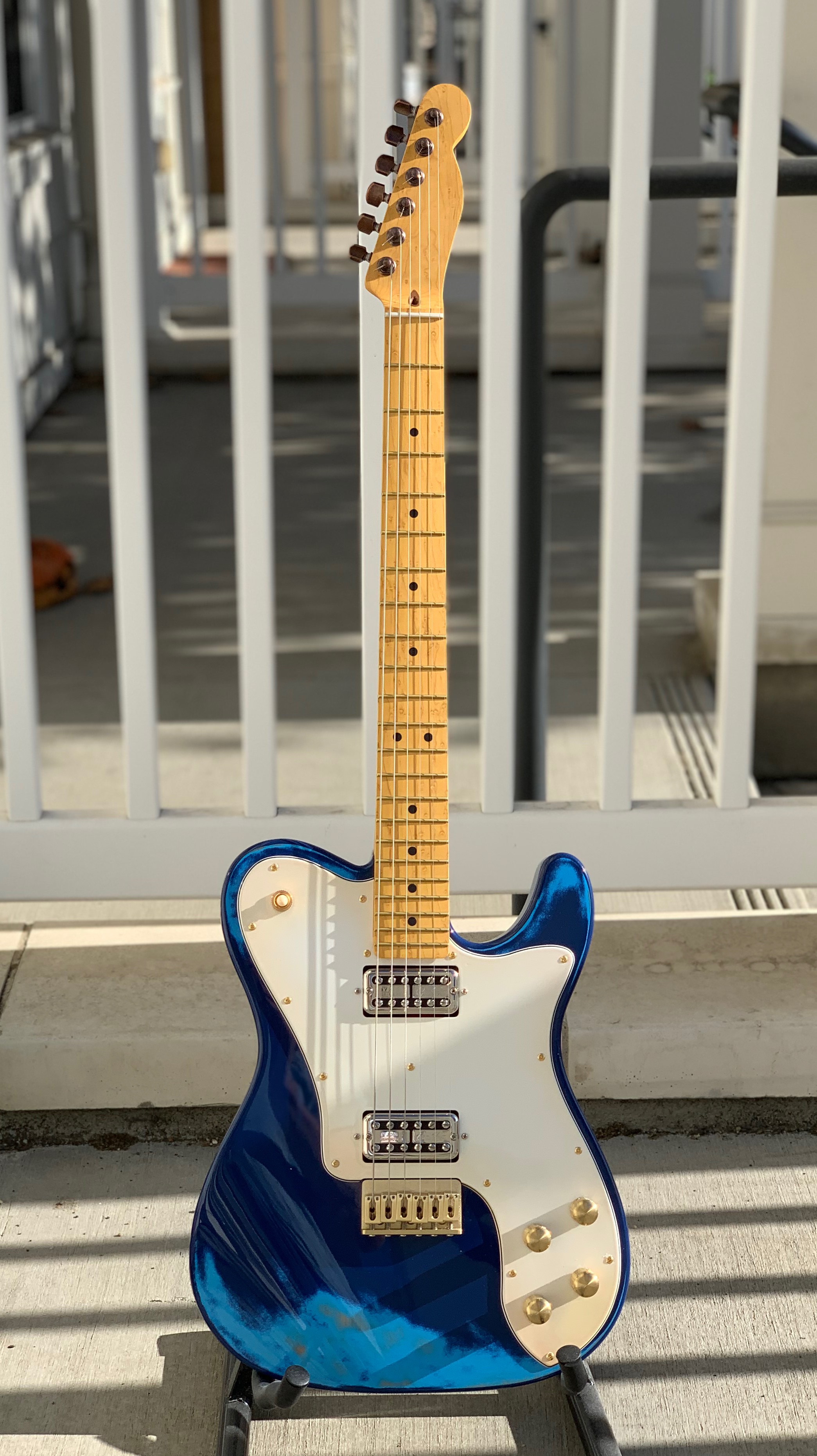 Telecaster shape, custom ‘faux relic’ paint by Daneen, gloss finish.