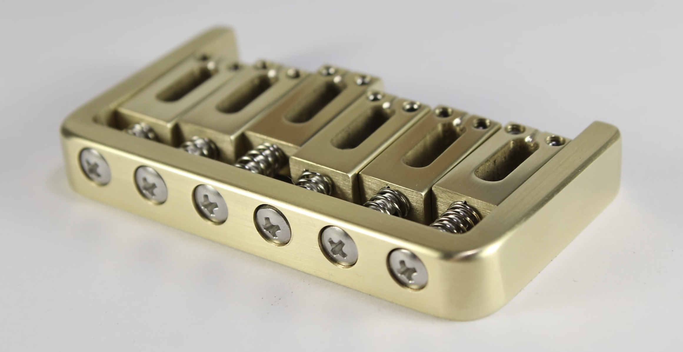 Custom bridge design, with saddles and bass plate machined from brass billet, built by Twangmart.